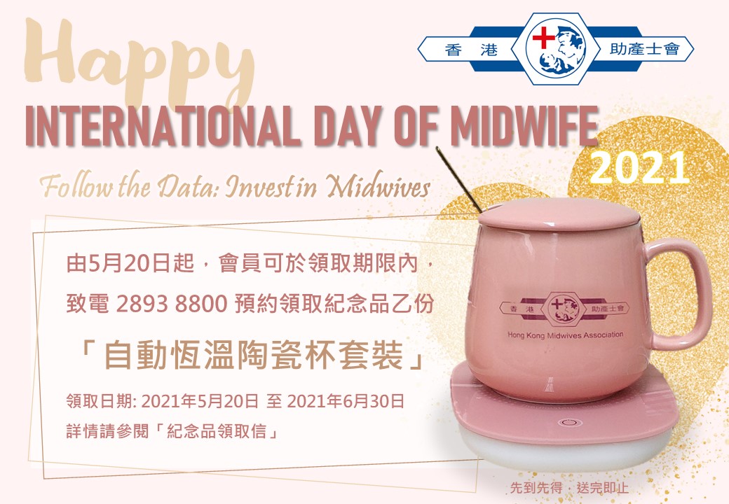 5月5日是國際助產士節(International Day of the Midwife),今年的主題是【Follow the Data: Invest in Midwives】。為紀念這特別的日子及表達對會員的支持與鼓勵,本會訂製了自動恆溫陶瓷杯套裝送贈各會員,祝願各位助產士同業在專業的工作上繼續與產婦同行,提供適切關顧,盡顯愛心!