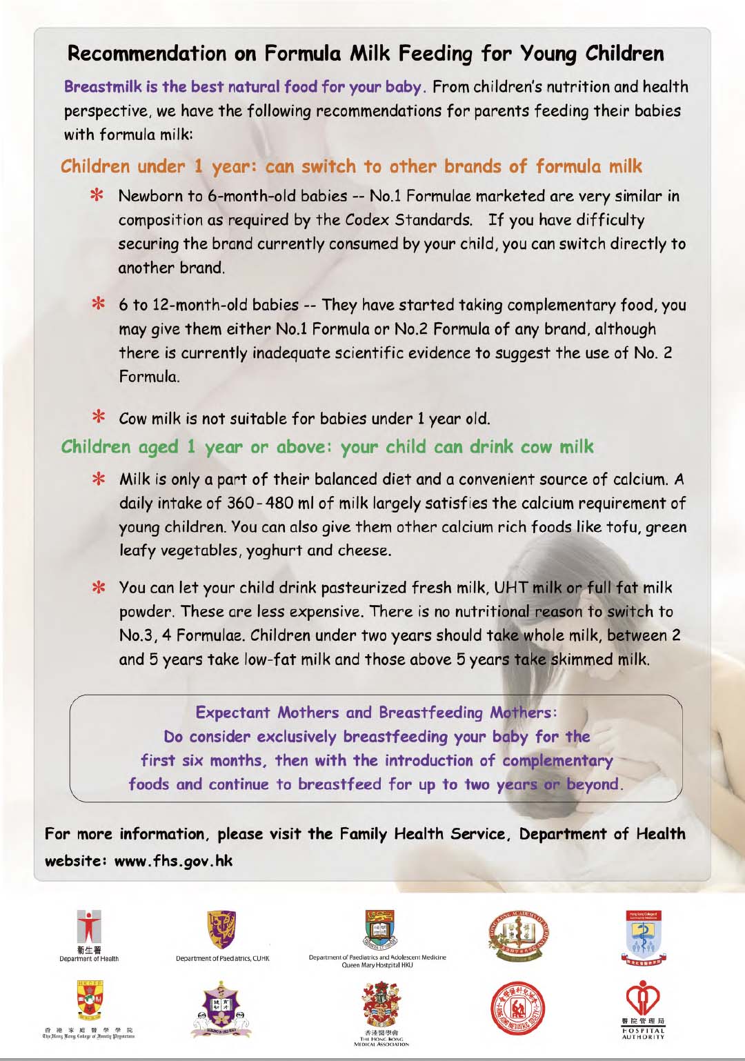 In view of the recent concern about the shortage of formula milk supply, a joint statement poster of recommendations to parents on formula milk feeding for young children has been issued by the Department of Health (DH) and nine health professional organizations.