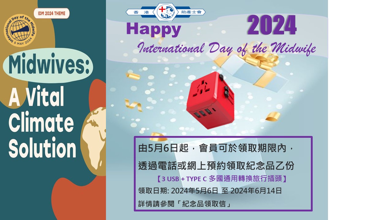 5月5日是國際助產士節(International Day of the Midwife),今年的主題是【Midwives: A Vital Climate Solution】。為慶祝這特別的日子及表達對會員的支持與鼓勵,本會訂製了【3 USB+TYPE C多國通用轉換旅行插頭】送贈各會員,祝願各位助產士同業在專業的工作上繼續與產婦同行,提供適切關顧,盡顯愛心!