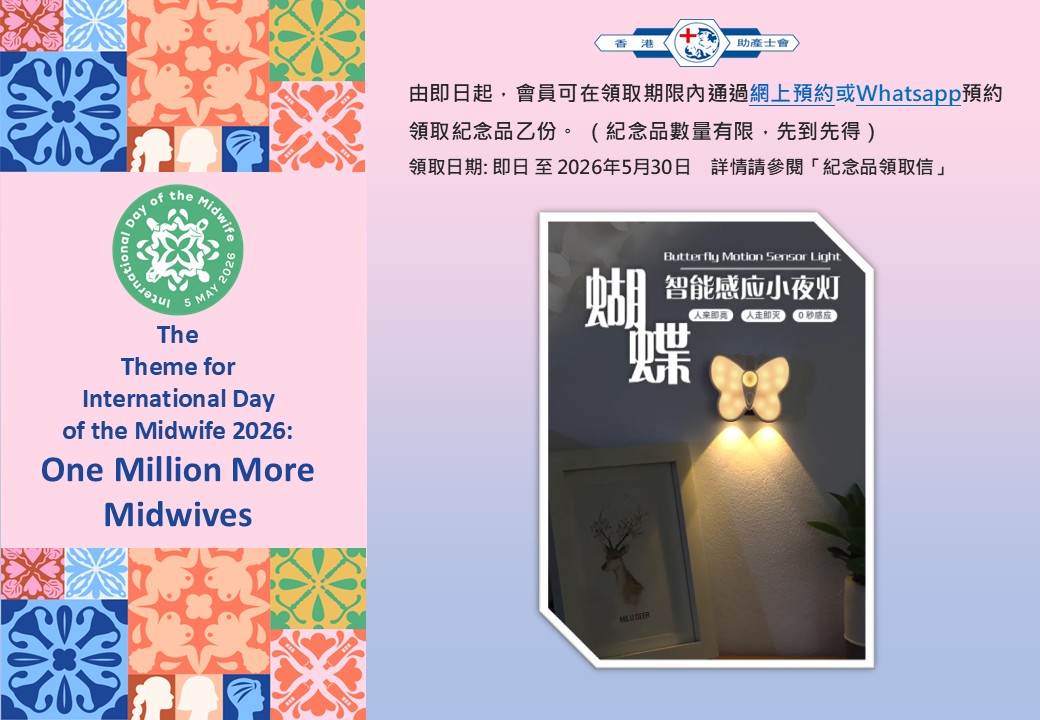 5月5日是國際助產士節(International Day of the Midwife),今年的主題是【One Million More Midwives】。為慶祝這特別的日子及表達對會員的支持與鼓勵,本會訂製了【蝴蝶形智能感應小夜燈】送贈各會員。